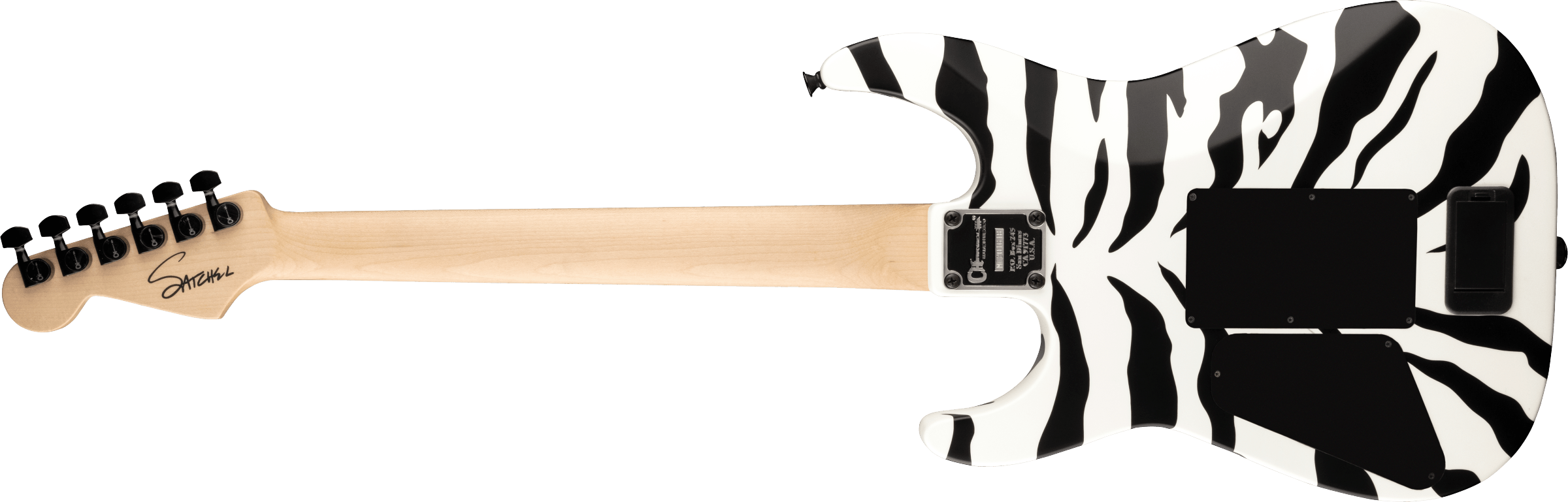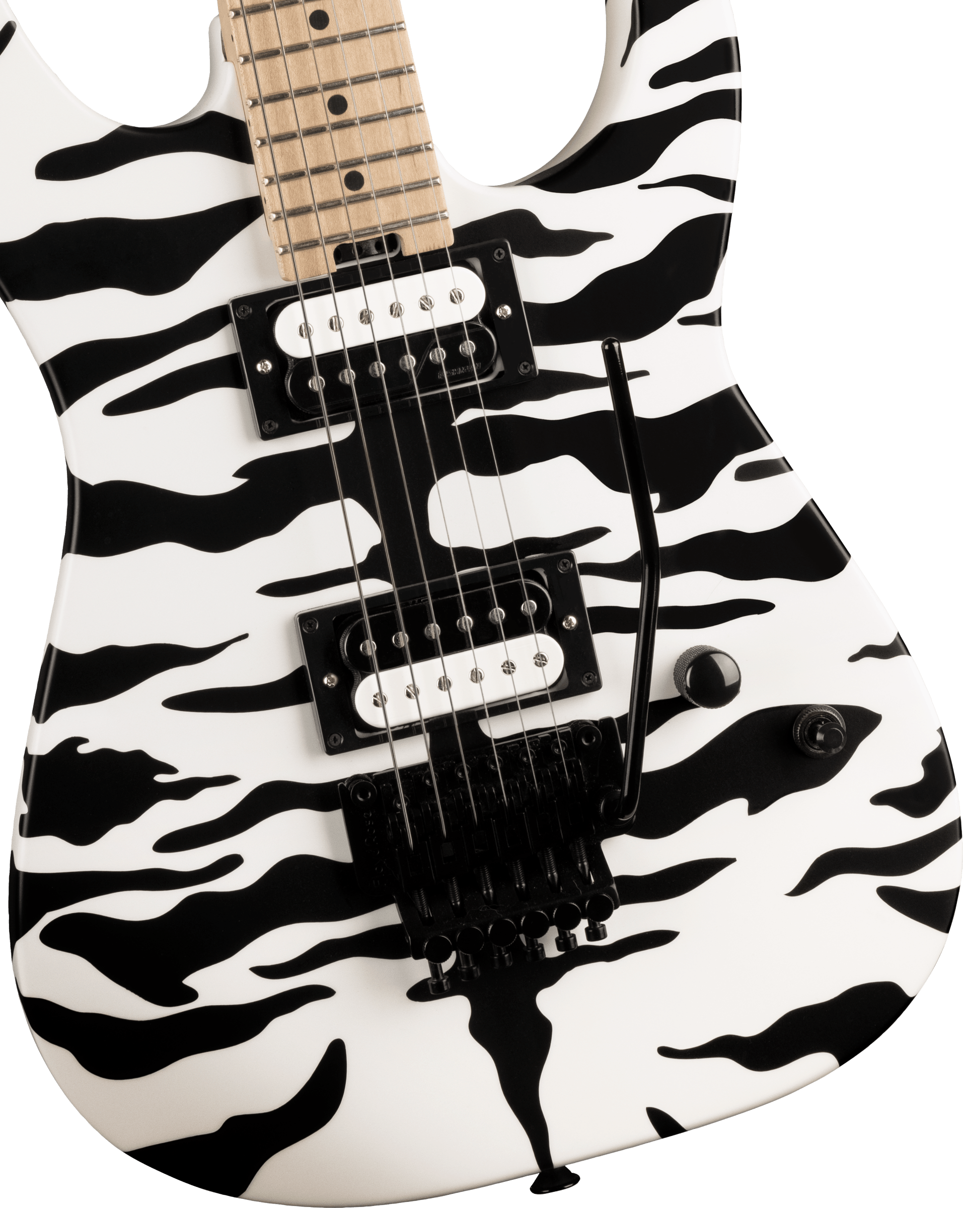 The bolt-on maple neck has a Fender® Stratocaster® headstock with Charvel-branded die-cast tuners, graphite reinforcement, heel-mount truss rod adjustment wheel and Charvel neck plate. Atop that is a 12"-16" compound-radius maple fingerboard with 22 jumbo frets and black dot inlays. Other features include a three-way toggle pickup switch, top-loaded Floyd Rose® 1000 Series double-locking tremolo bridge system, and more.