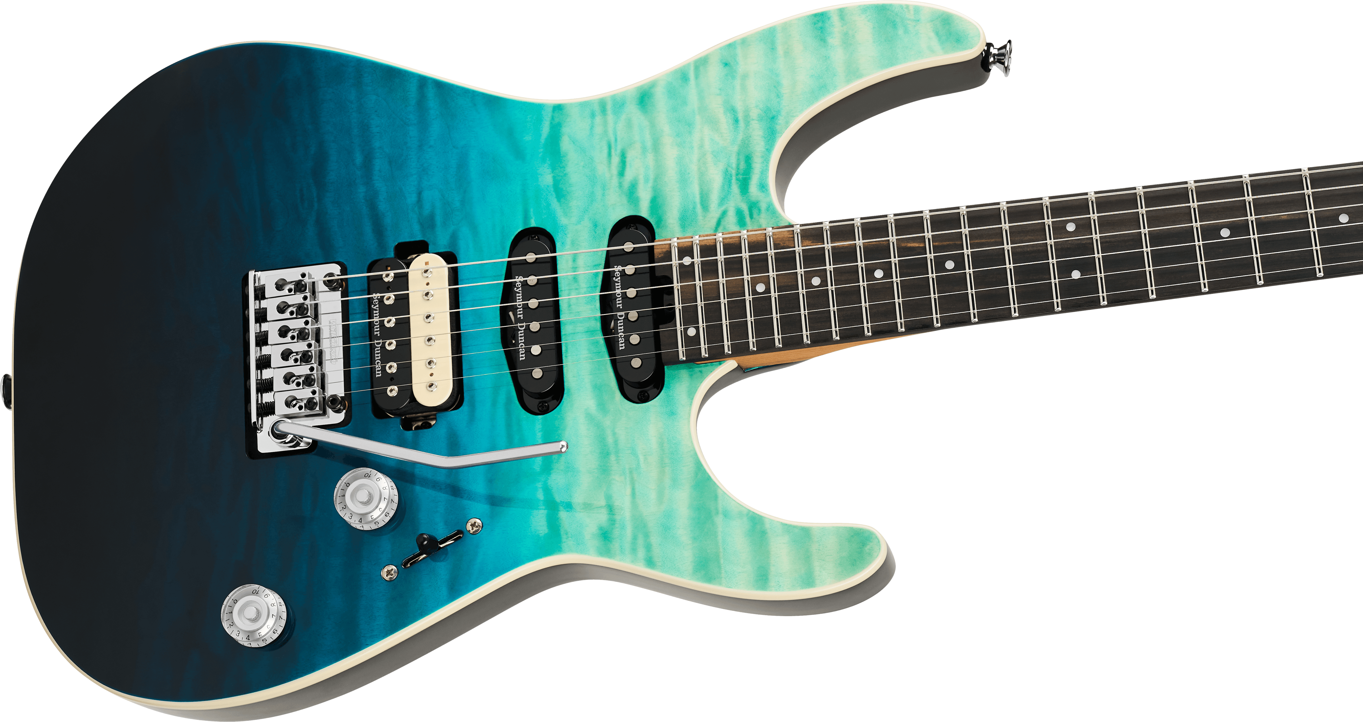 This axe features an HSS pickup configuration consisting of a direct mount Seymour Duncan® Full Shred™ TB-10 bridge pickup and direct mount Seymour Duncan® Custom Flat Strat® SSL-6 single-coil middle pickup and Seymour Duncan Custom Flat Strat SSL-6 RWRP single-coil neck pickup ith plenty of focused humbucker grit and springy vintage snap.